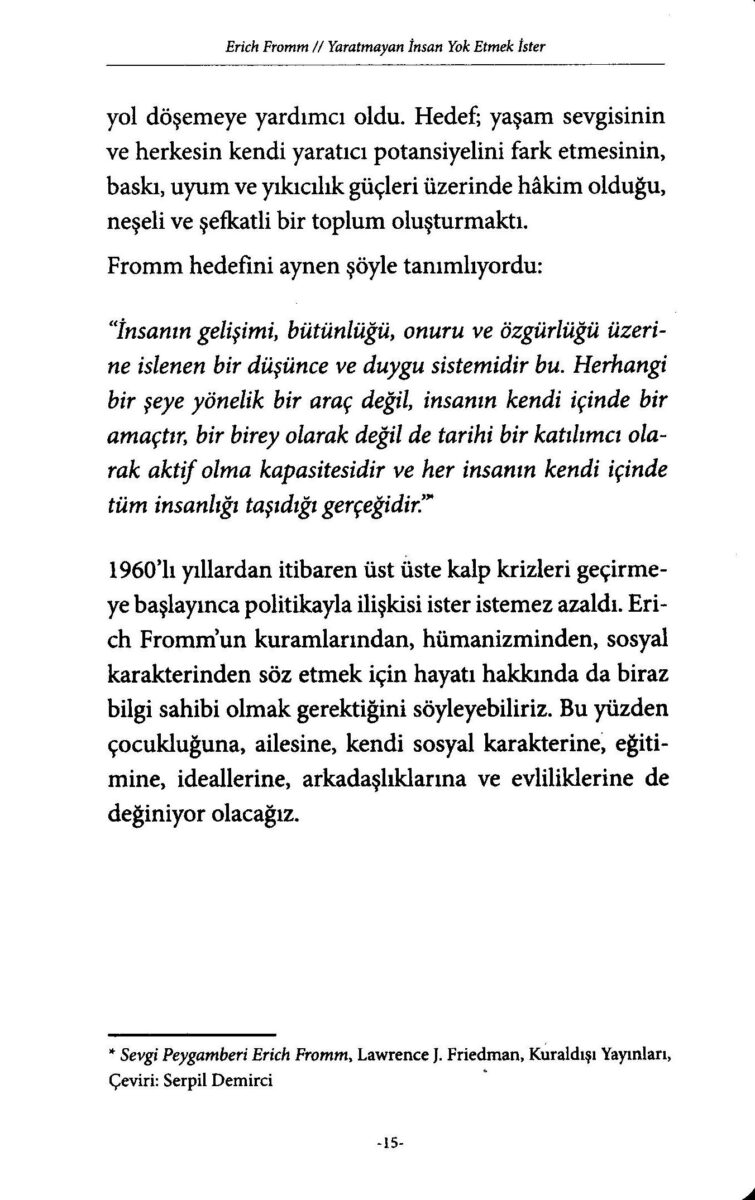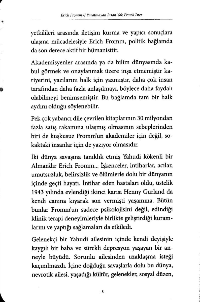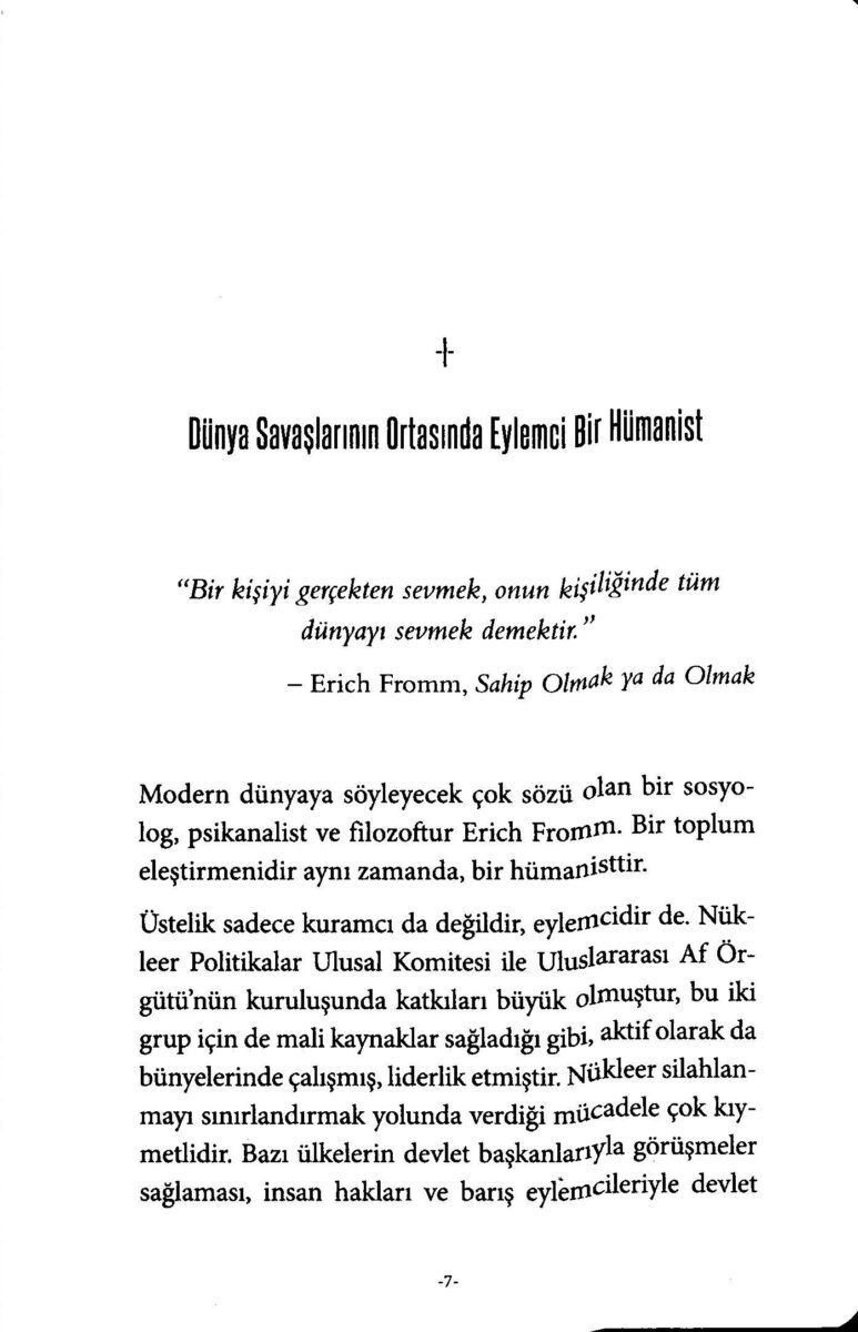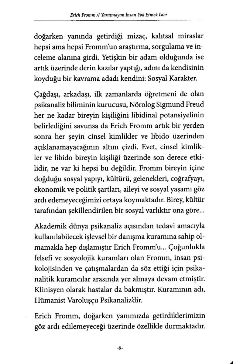 Modern dünyaya söyleyecek çok sözü olan bir sosyolog, psikanalist ve filozoftur Erich Fromm. Bir toplum eleştirmeni ve bir hümanisttir aynı zamanda. Üstelik sadece kuramcı değil eylemcidir de… İki dünya savaşına tanıklık etmiş Yahudi kökenli bir Alman olarak işkencelerle, intiharlarla, acılarla ve ölümlerle dolu bir dünyanın içinde geçmiştir hayatı.