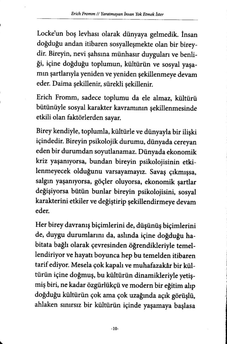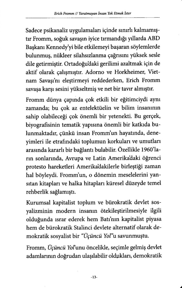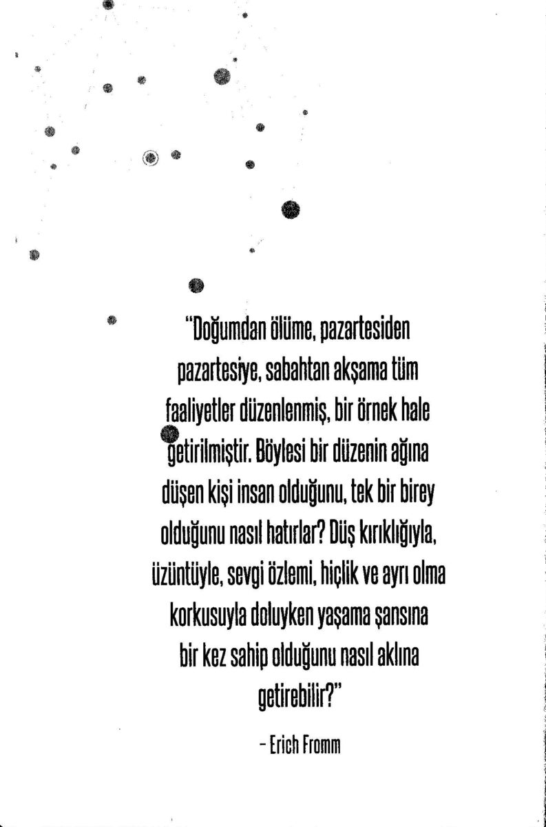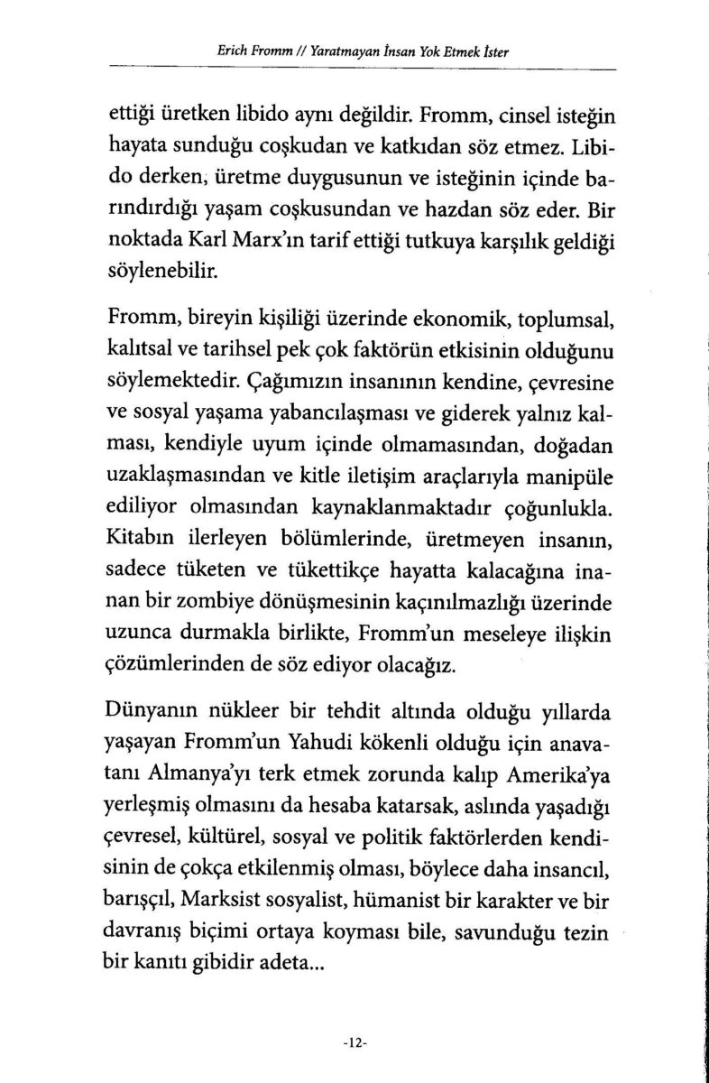 Modern dünyaya söyleyecek çok sözü olan bir sosyolog, psikanalist ve filozoftur Erich Fromm. Bir toplum eleştirmeni ve bir hümanisttir aynı zamanda. Üstelik sadece kuramcı değil eylemcidir de… İki dünya savaşına tanıklık etmiş Yahudi kökenli bir Alman olarak işkencelerle, intiharlarla, acılarla ve ölümlerle dolu bir dünyanın içinde geçmiştir hayatı.