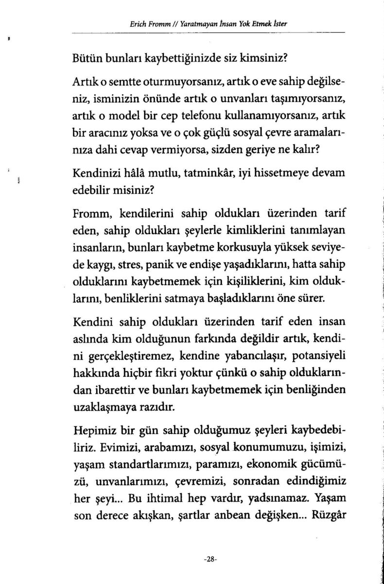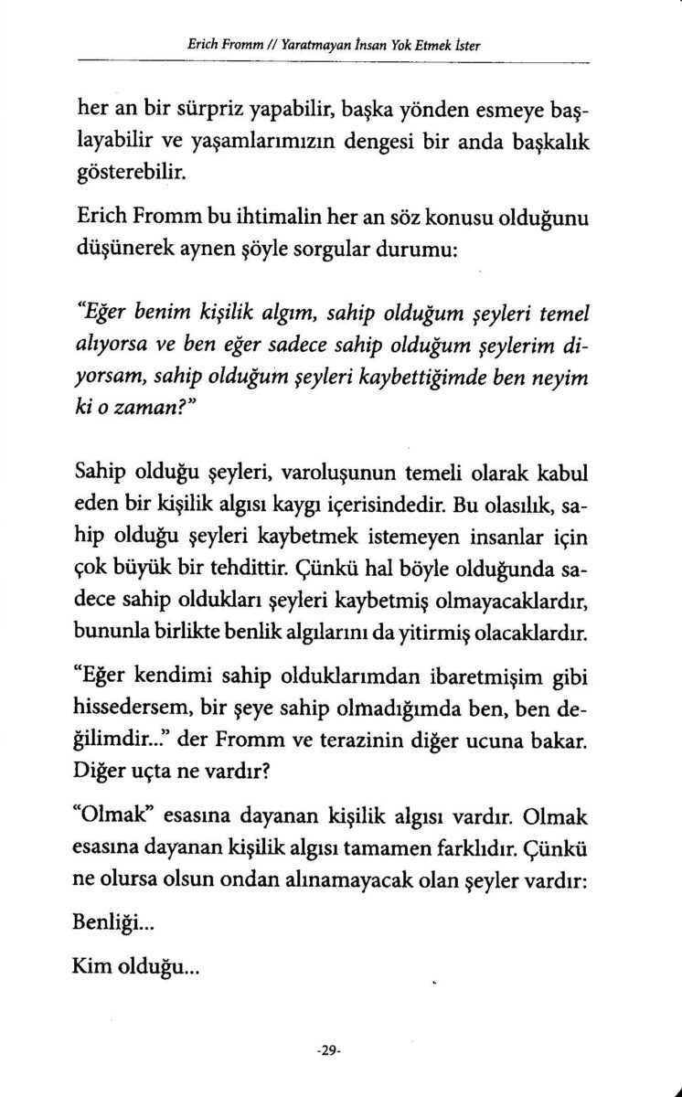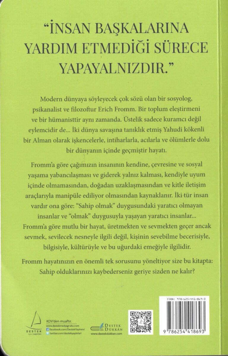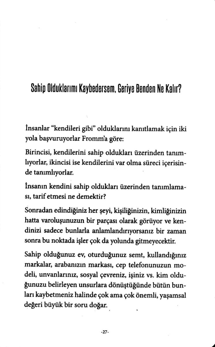 Fromm hayatınızın en önemli tek sorusunu yöneltiyor size bu kitapta: Sahip olduklarınızı kaybederseniz geriye sizden ne kalır?